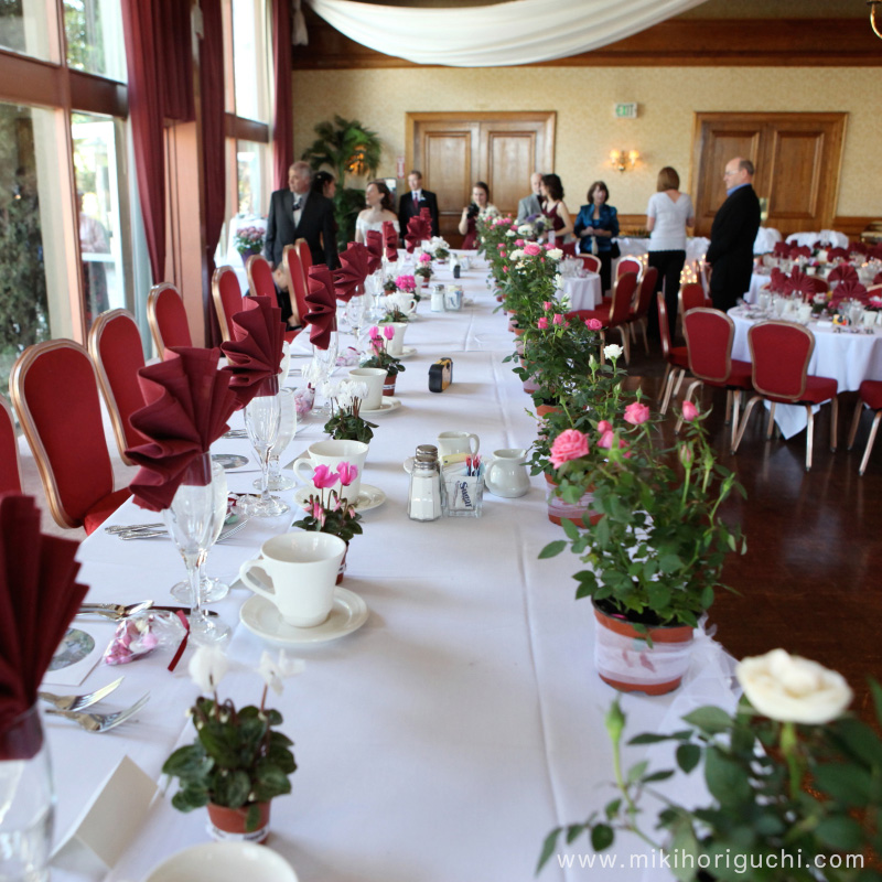 披露宴会場を飾るお花もポットに入ったミニシクラメンやミニバラが主流。実はこれ、ゲストのお持ち帰りギフトなのです。