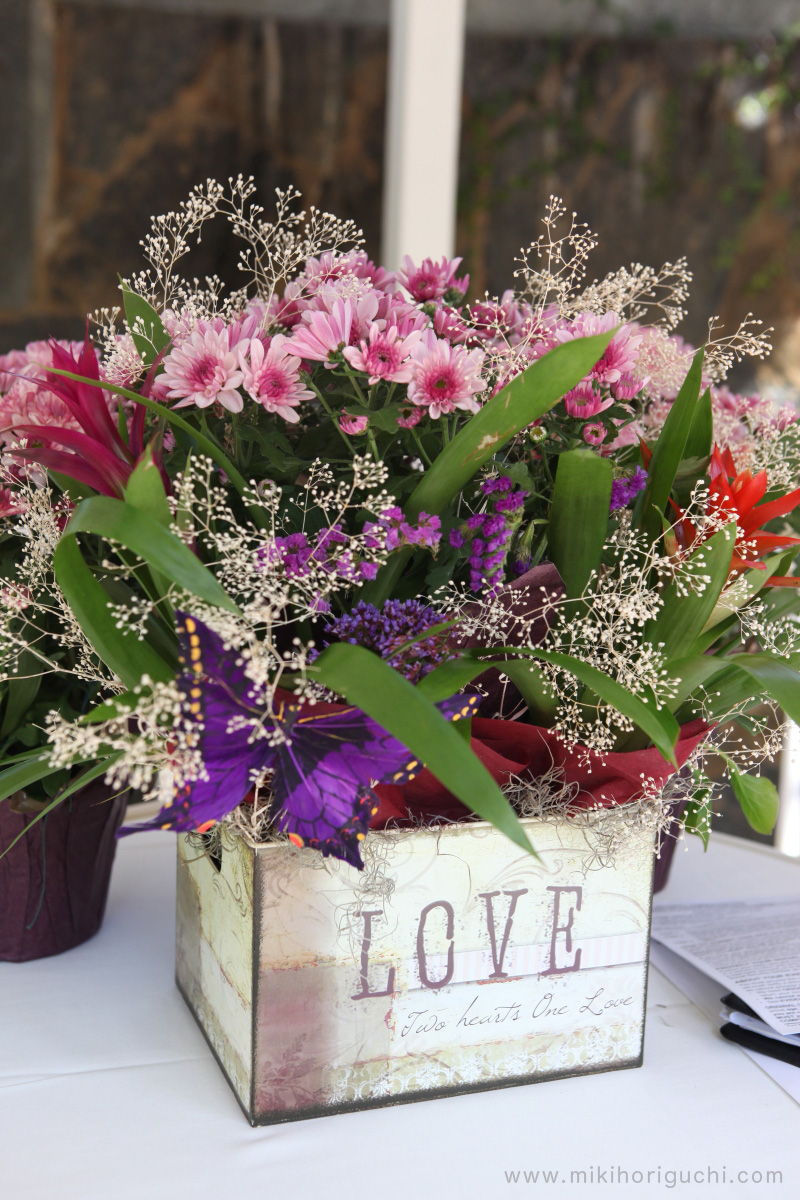祭壇を飾る花も、切り花でなく、おしゃれな木箱にアレンジした鉢植えの花々。