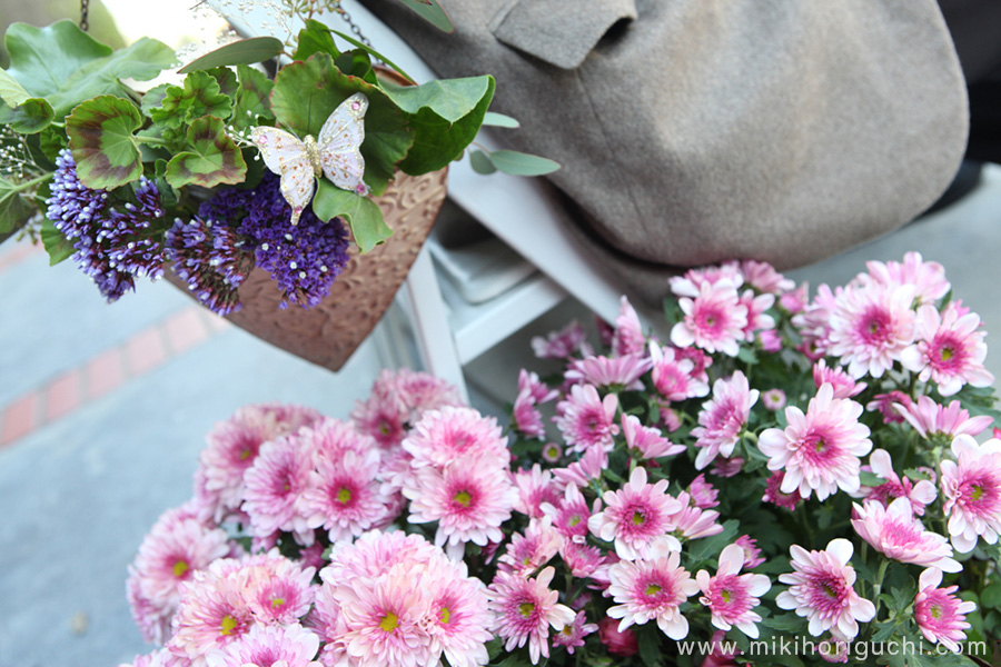 イスの横には鉢植えの花が花盛り。