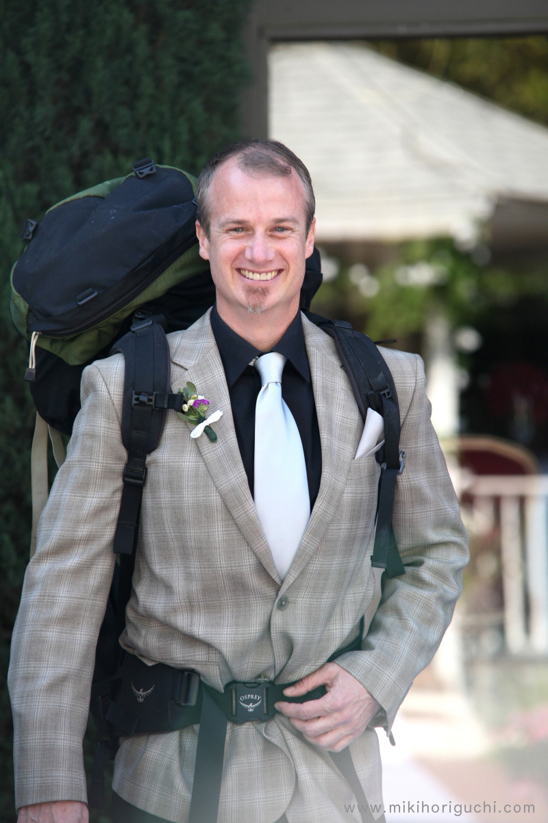 セレモニーに山岳バッグをかついで登場したお茶目な新郎。